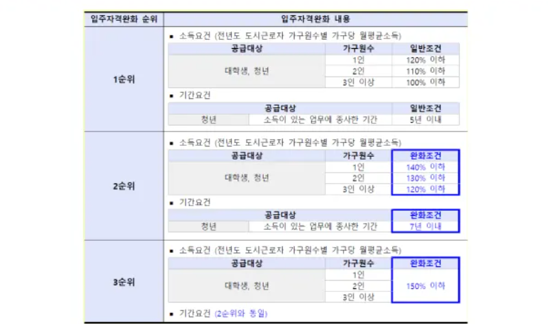 - 1순위: 도시근로자 가구당 월평균소득 100~120% 이하