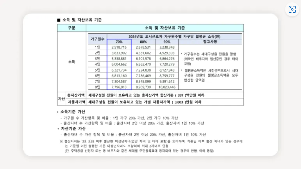 신청 자격은 무주택세대구성원으로서, 아래의 소득 및 자산 기준을 충족해야 합니다.