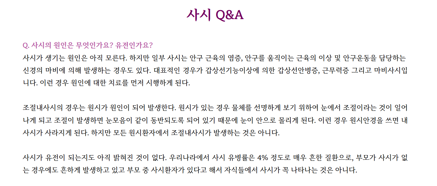 - 사시 유형(내사시, 외사시, 수직사시, 간헐성 등)에 따라 치료 방향이 다름