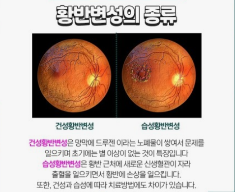- 건성 황반변성은 황반 부위에 드루젠이라는 노폐물이 축적되어 서서히 시력을 약화시키는 형태입니다.