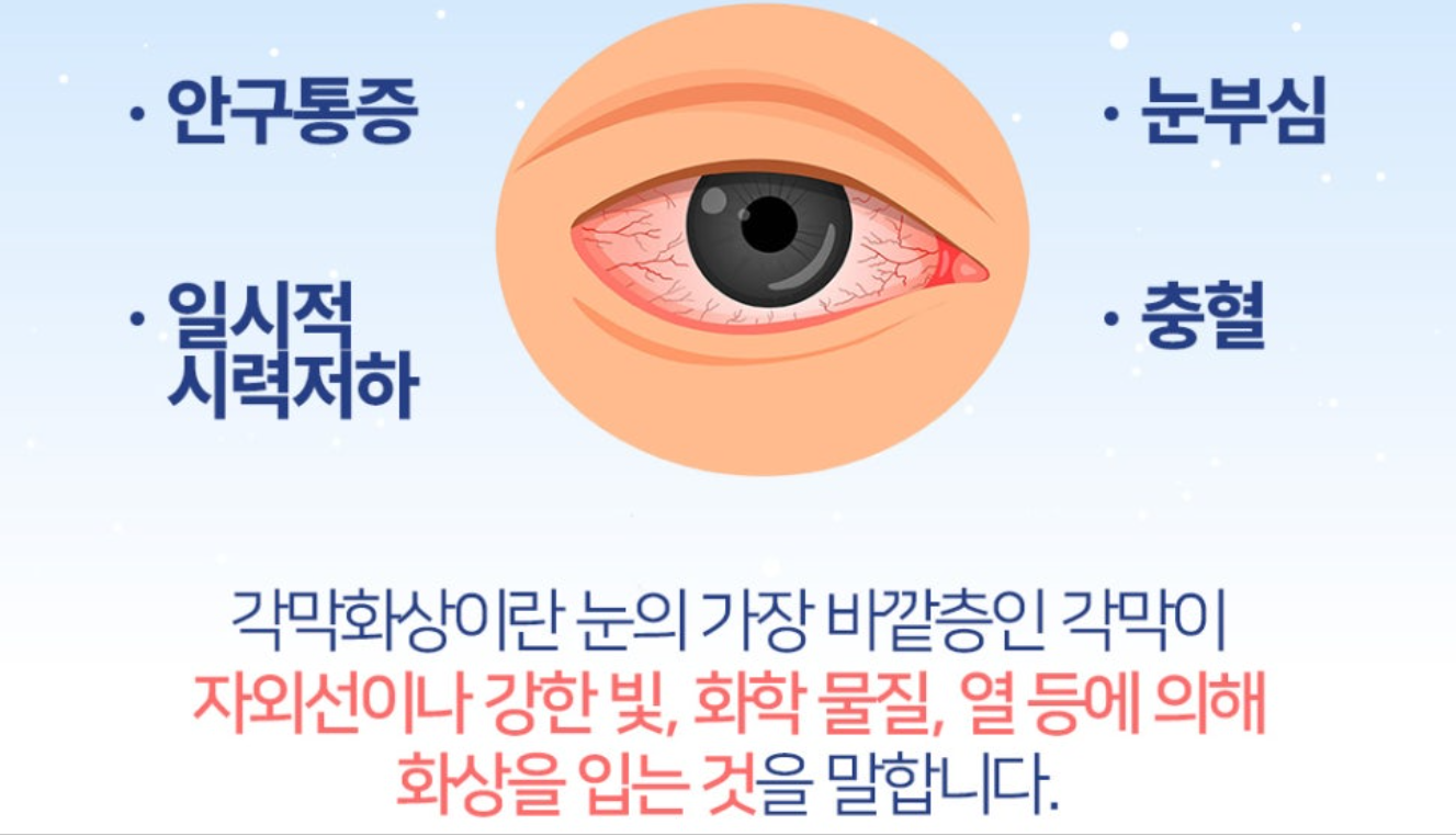 - 갑작스러운 노출 이후 증상이 빠르게 나타났다면 ‘각막화상’일 가능성이 높고,