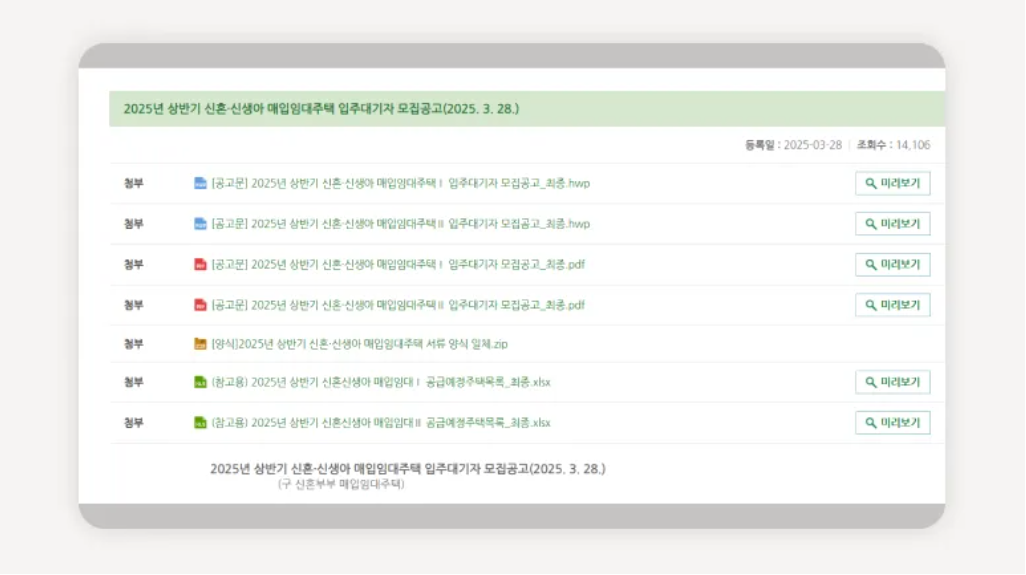 모집공고일인 2025년 3월 27일부터 각 기관의 홈페이지를 통해 신청할 수 있으며, 공급 기관별로 조건 및 서류가 다르므로 반드시 해당 홈페이지에서 확인하시기 바랍니다.