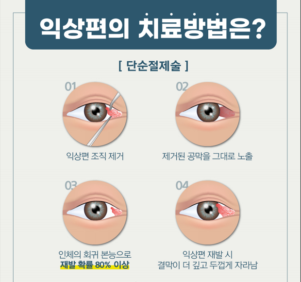 익상편을 절제한 뒤, 결막 이식술을 함께 시행하면 재발률을 크게 낮출 수 있습니다. 최근에는 자가결막이식술이 많이 사용되며, 회복도 빠르고 예후가 좋습니다.