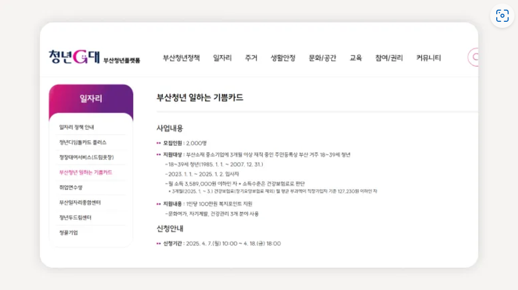 - 신청 방법: 부산 청년 일하는 기쁨카드 누리집(young.busan.go.kr)에서 온라인 신청
