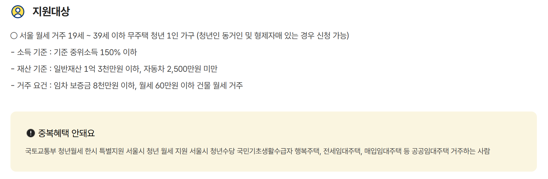 - 기존에 서울시 청년월세지원 또는 국토교통부 청년월세 한시 특별지원을 받은 자