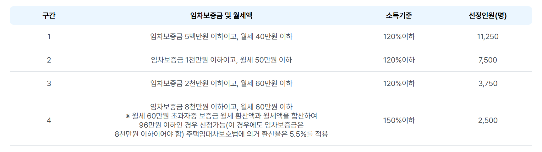 - 신청자가 많을 경우, 임차보증금, 월세, 소득 기준에 따라 4개 구간으로 나누어 전산 무작위 추첨을 통해 선정됩니다.