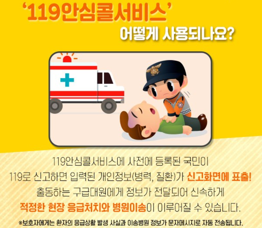 119 안심콜 서비스는 응급 상황에서 119에 전화하면 신고자 건강정보가 자동 전송되어 보다 빠른 응급처치가 가능하도록 돕는 제도입니다.
