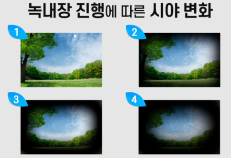 - 시야 결손: 중심 시야는 유지되지만 주변 시야가 좁아짐