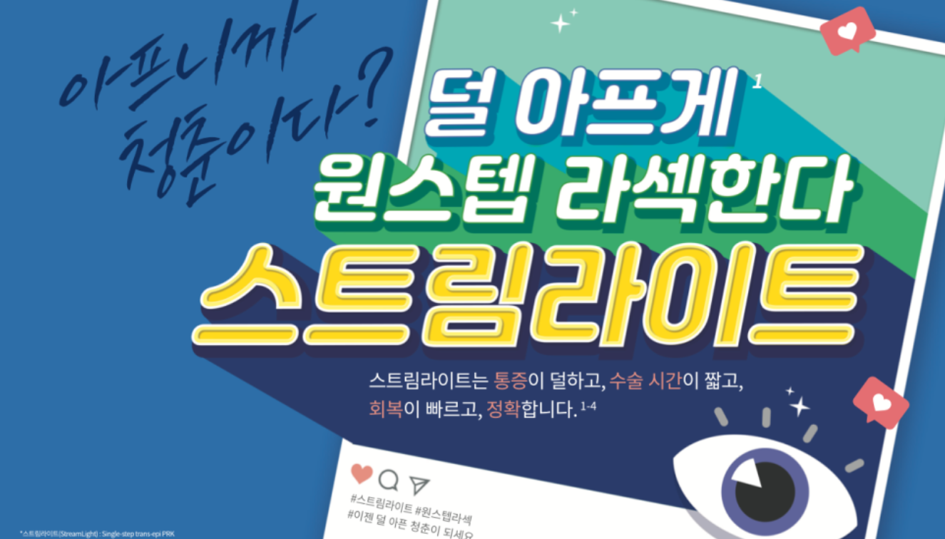 엑시머레이저로 상피를 정밀하게 제거하기 때문에 회복 속도가 빠르고 통증이 적은 편입니다. 기존 라섹의 회복 기간이 5~7일이라면 스트림라이트 라섹은 3~4일 정도 소요됩니다.