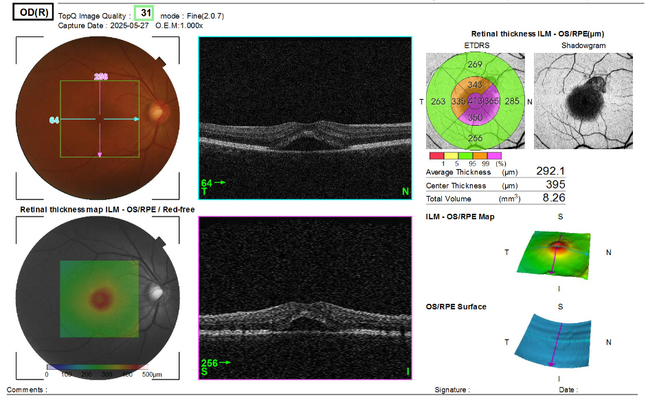 - 중심망막 두께: 395μm (정상 대비 현저히 증가 → 황반부종 의심)