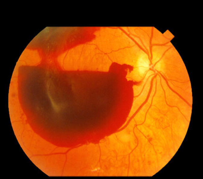 - 가능한 원인: 전방출혈, 초자체출혈, 혈관 이상