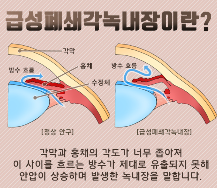 - 급성 녹내장: 몇 시간 안에 안압을 낮추지 않으면 회복 불가능
