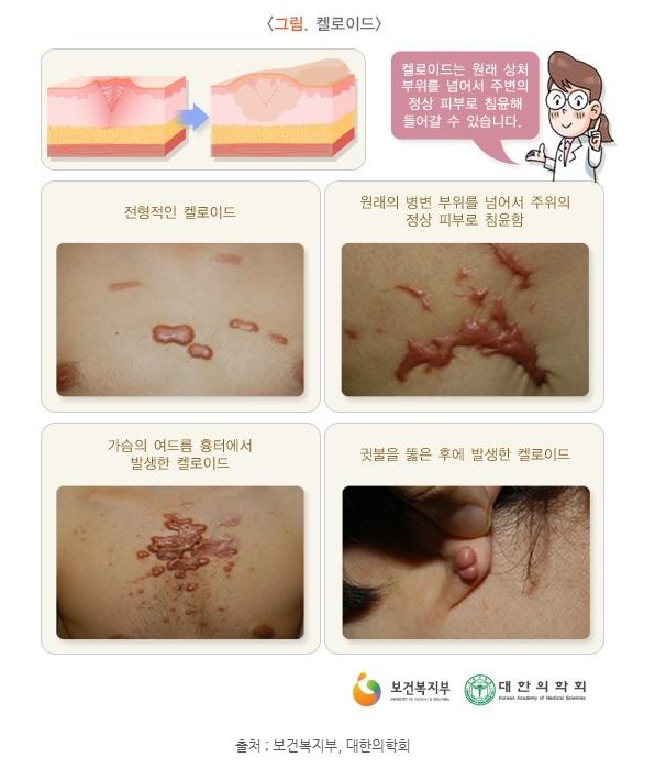 켈로이드는 상처 치유 과정에서 비정상적으로 과도한 흉터 조직이 생성되는 체질을 말합니다. 일반적인 흉터보다 두껍고 넓게 자라며, 가렵거나 통증을 동반할 수 있습니다.