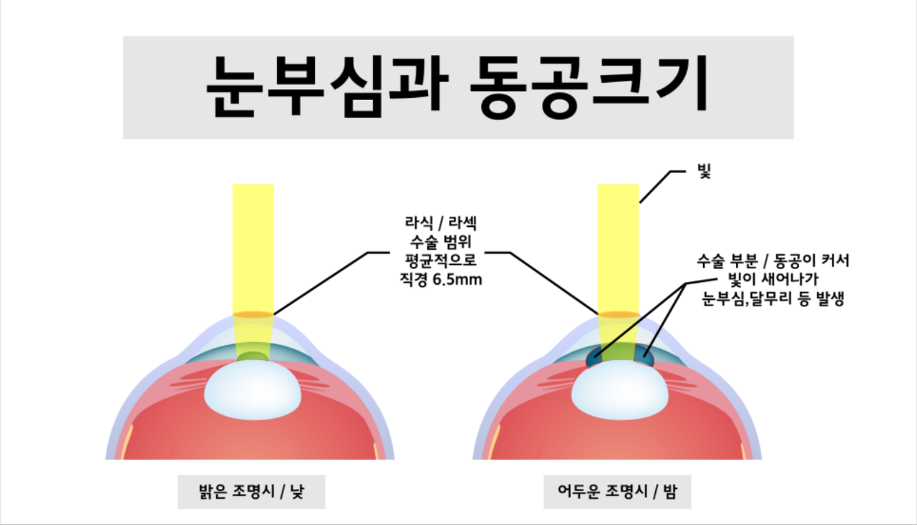 라식·라섹 수술 후 야간 빛번짐(Glare, Halo) 은 많은 환자가 경험하는 부작용 중 하나입니다. 이는 특히 동공 크기(Pupil Size) 와 밀접한 관계가 있습니다.